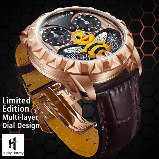 La montre Bee est le troisième produit de Lucky Harvey. À six heures, une abeille en dessin animé a été conçue à l'origine. À chaque fois, les ailes de l'abeille se déploient instantanément de bas en haut et se referment lentement au bout d'une heure. Même dans la nuit, la forte lumière ne craint pas l'obscurité, qui cache une vitalité tenace et innocente.